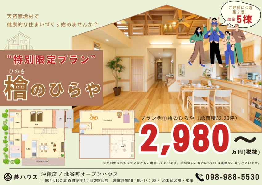 ご予約・お問い合わせは 夢ハウス沖縄店へお願いいたします。 営業時間:10時~17時 (火・水定休日を除く) TEL:098-988-5530 FAX:098-988-5531